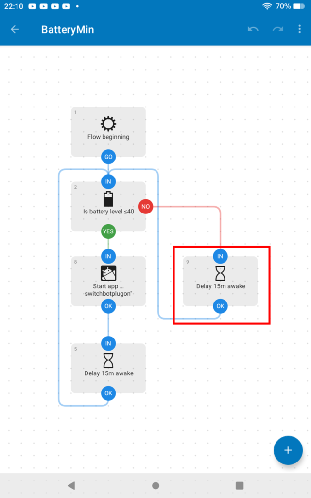 これで40%以下になるとSwitchbotプラグミニがONになり、80%になるとOFFにすることができます。バッテリーの数値は任意に指定できますので、50%~60%の間で充電制御することなども可能です。Androidアプリも思ったより簡単に作成できました。タブレットなどを自動で充電制御する際などにご活用ください。