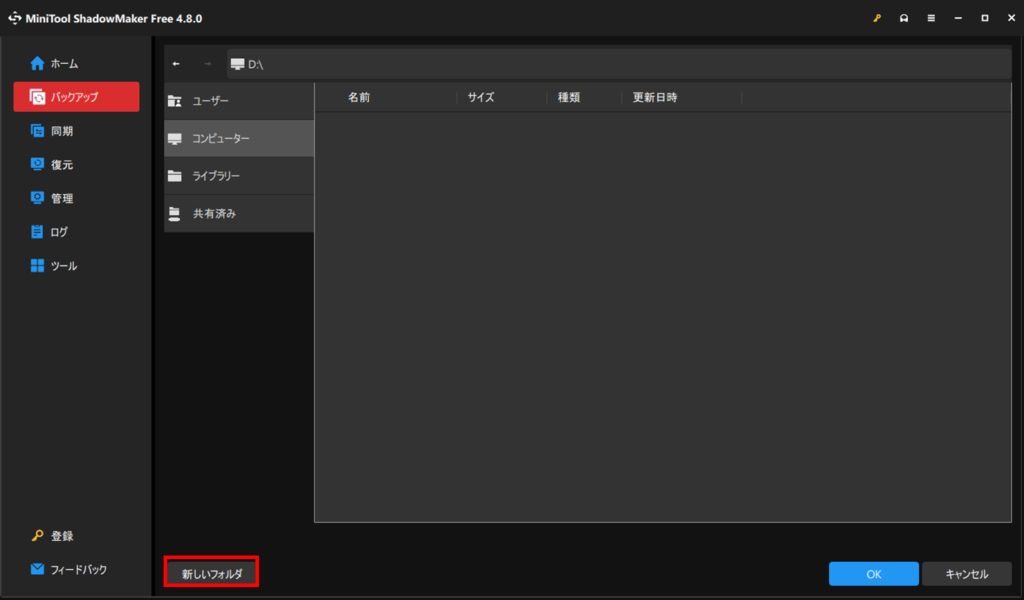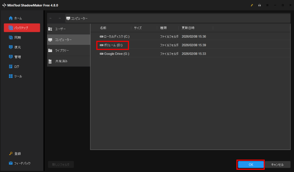 ここでは、Dドライブがバックアップ用ドライブですので、選択してOKを押します。