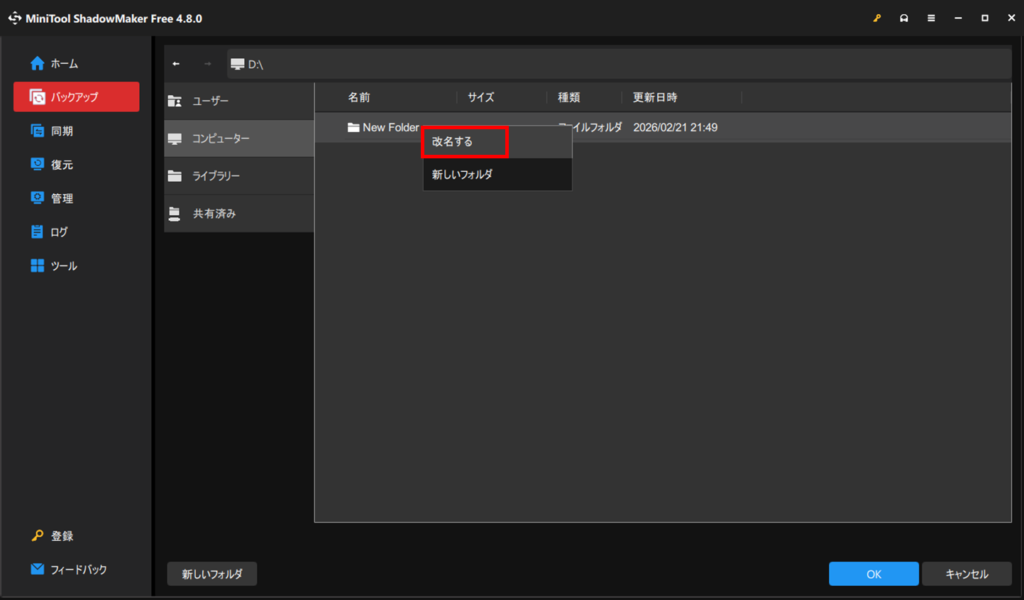 フォルダ名を右クリックすると、名前を変更できます。