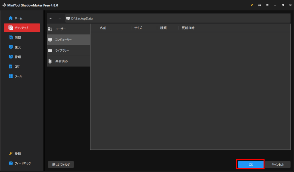 バックアップデータの保存先を選択して、OKボタンを押します。