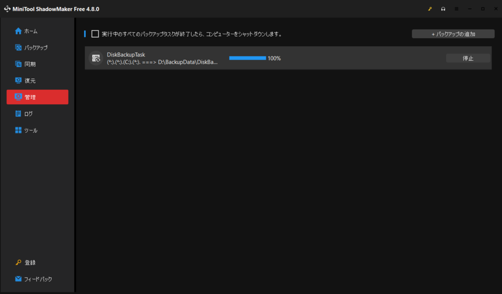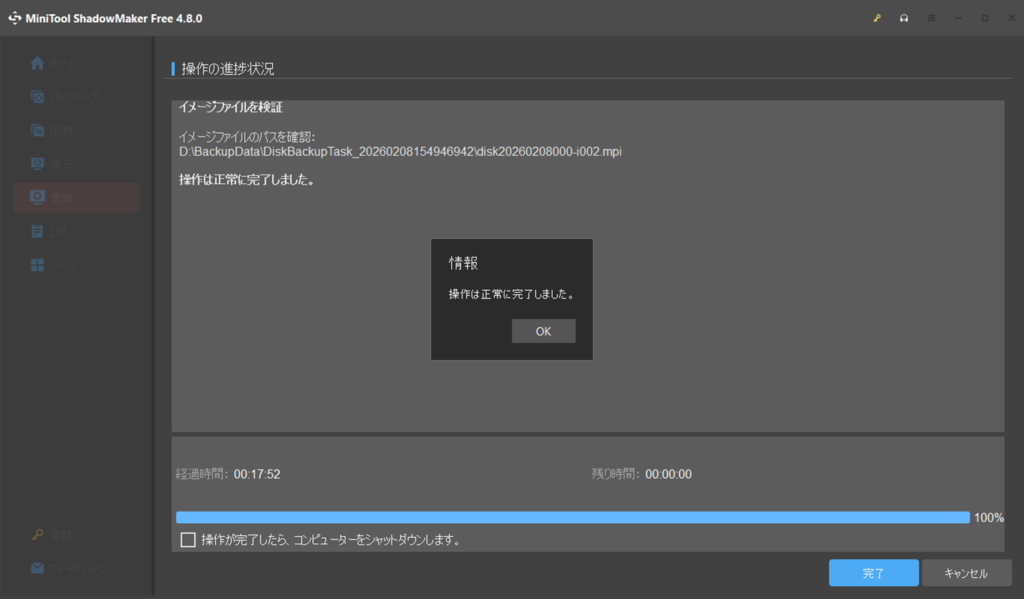 左側のメニューの「管理」に切り替わり、バックアップの進捗状況が表示されます。100%になるまで待ちましょう。コンピューターをシャットダウンしますにチェックを入れると、バックアップが終わるとパソコンをシャットダウンしてくれます。