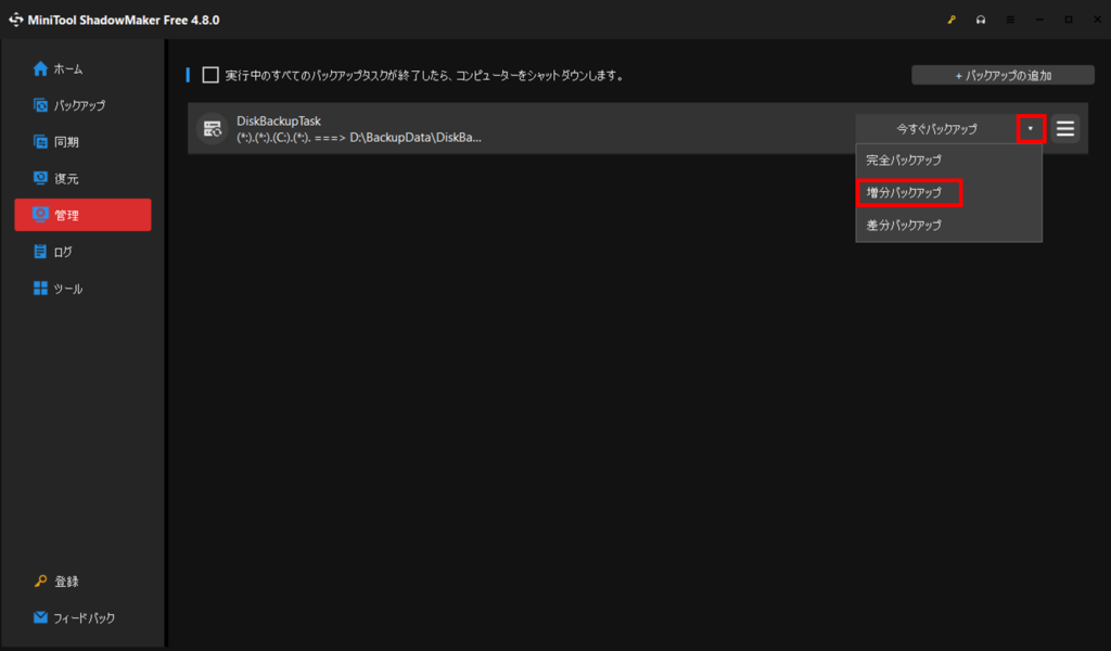 増分バックアップを選択します。