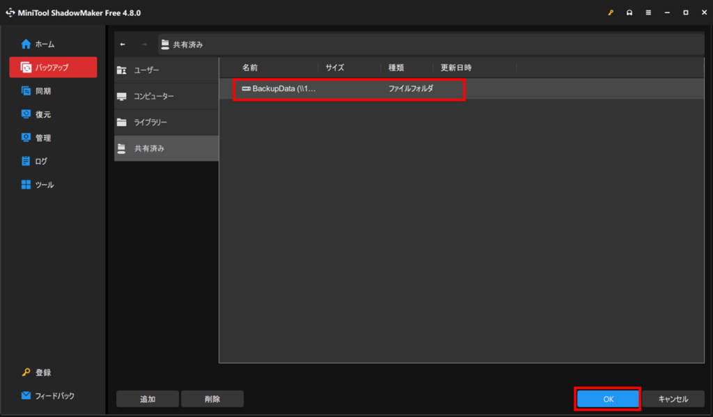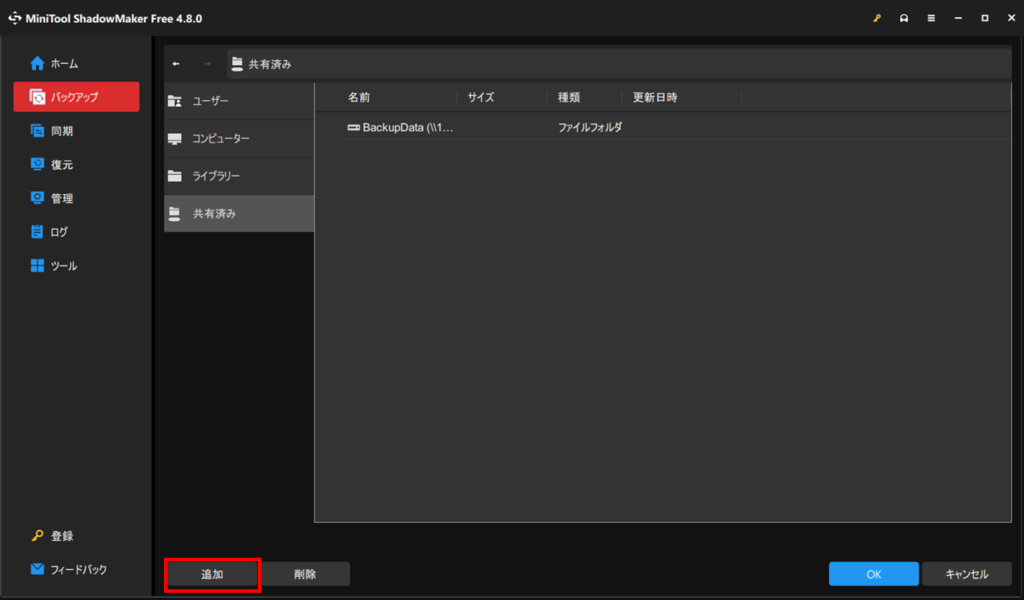 ファイルサーバーを立てて、共有フォルダにバックアップしたい場合はバックアップ先を「共有済み」にする必要があります。まずバックアップ先を選択します。