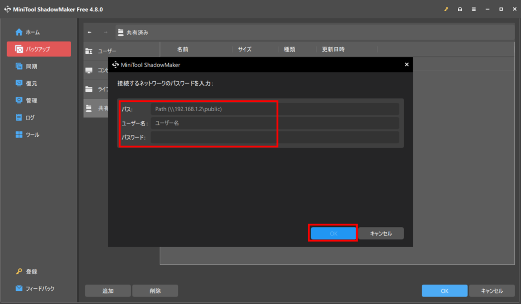 サーバーのアドレスとユーザー名・パスワードを入力します。入力し終えたらOKを押します。