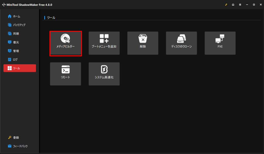 左側のメニューバーのツールを選択し、メディアビルダーを押します。