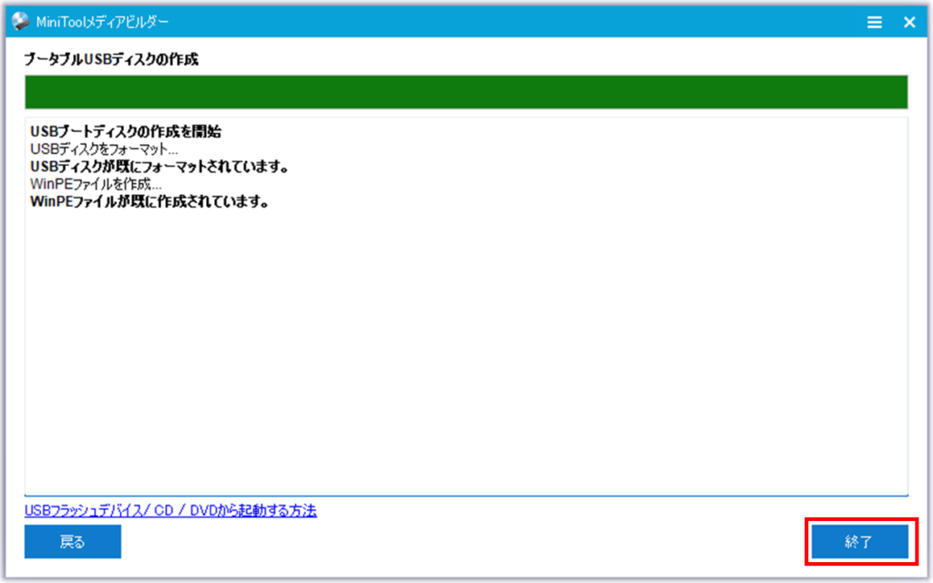 進捗が100%になったら終了ボタンを押します。