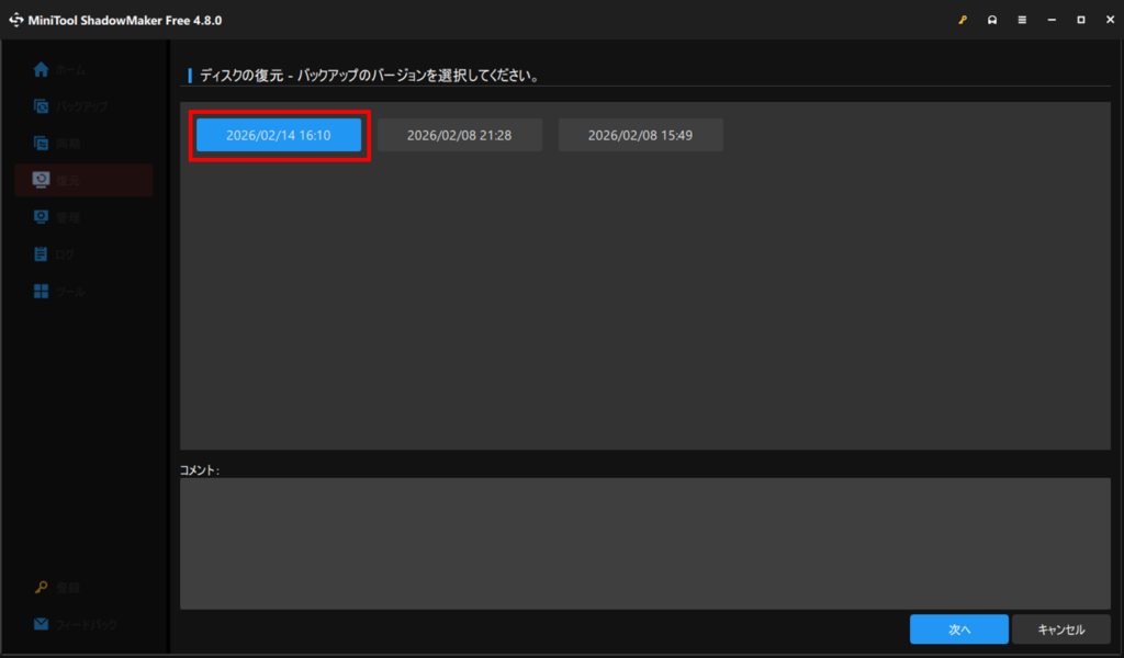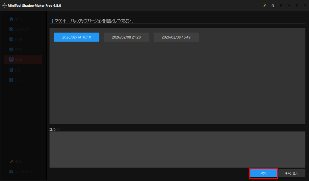 マウントするバックアップバージョンを聞いてくるので、参照したいデータを選択して次へを押します。例えば2/14時点のデータを見たい場合は、下図のように2/14を選択します。