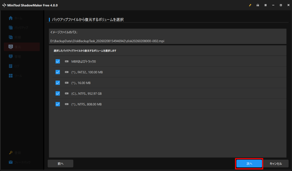 復元するボリューム選択画面が出ます。基本的に変更する必要はありませんので、そのまま次へを押します。