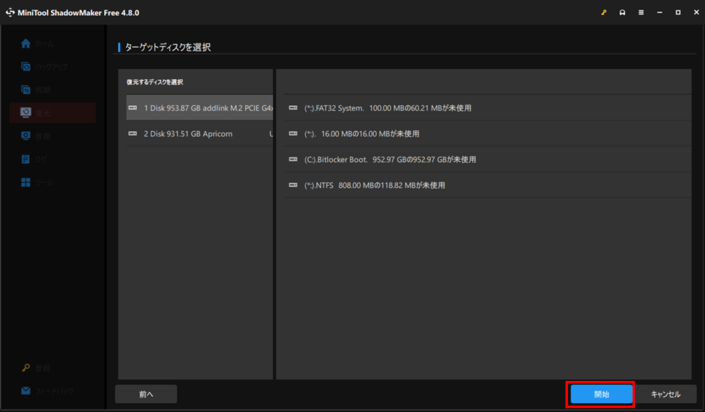 ターゲットディスクを選択して、開始ボタンを押します。※ターゲットディスクにバックアップデータが展開されます。