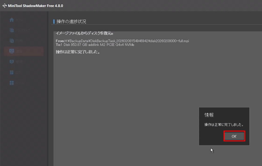 復元が完了したらOKを押します。