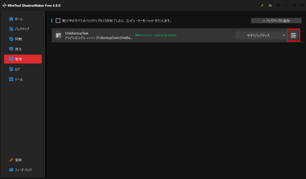 メニューの管理から、今すぐバックアップの右側にある三本線のボタンを押します。
