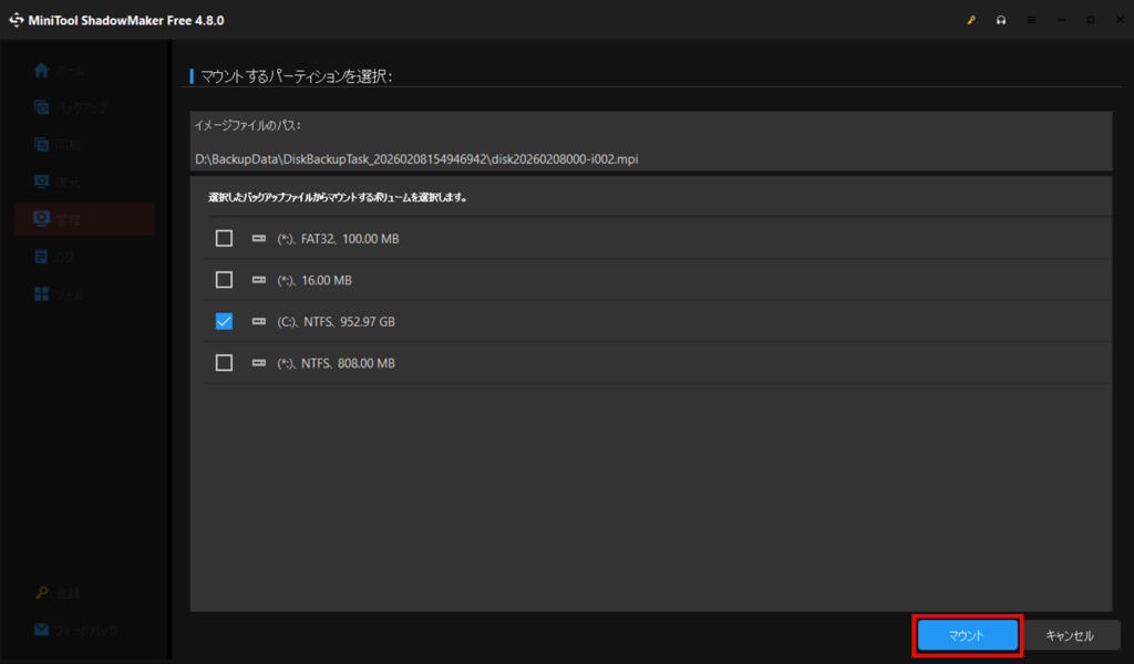 システム全体を復元するのではなく、あるファイルだけ参照したい、という場合はバックアップデータを一時的に参照することができます。