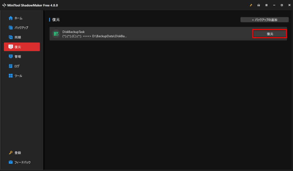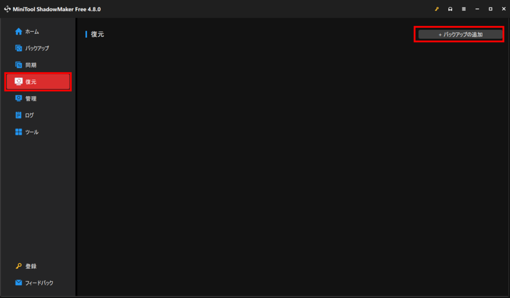 ソフトが起動したら、左側のメニューの復元を選択し、バックアップの追加ボタンを押します。
