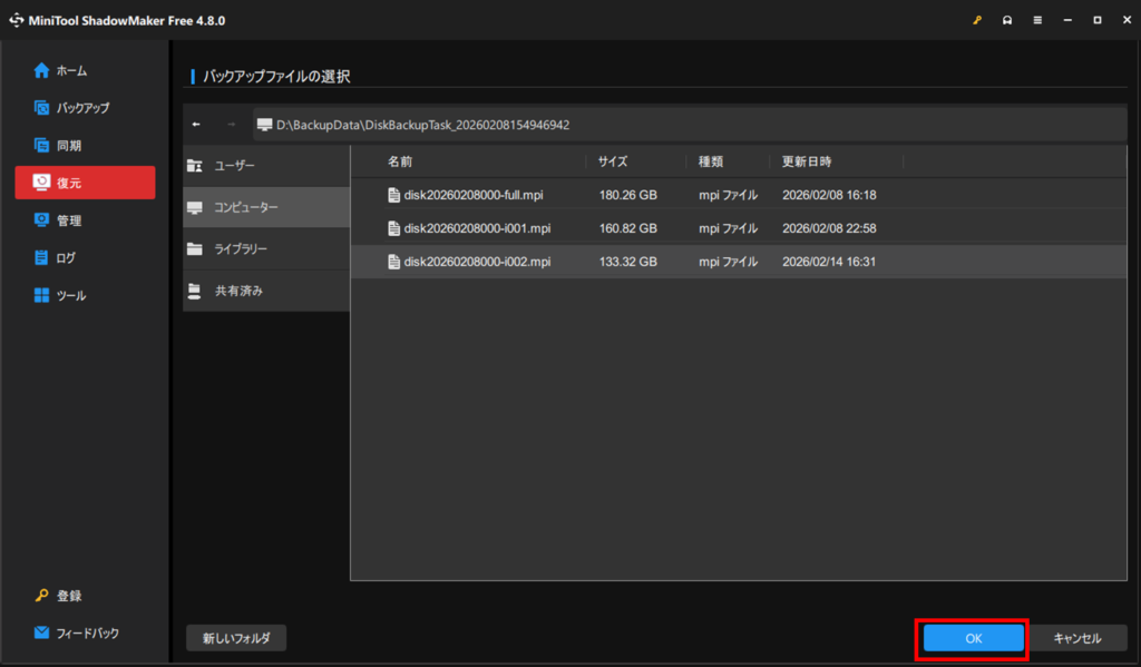 バックアップデータは拡張子がmpiのファイルです。