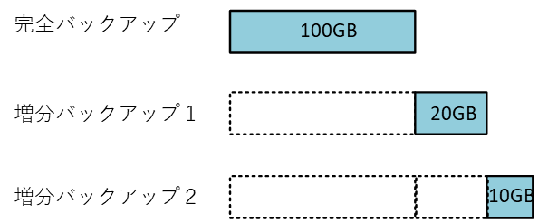 増分バックアップは下図のように変更があった分だけ追加でバックアップする方式です。