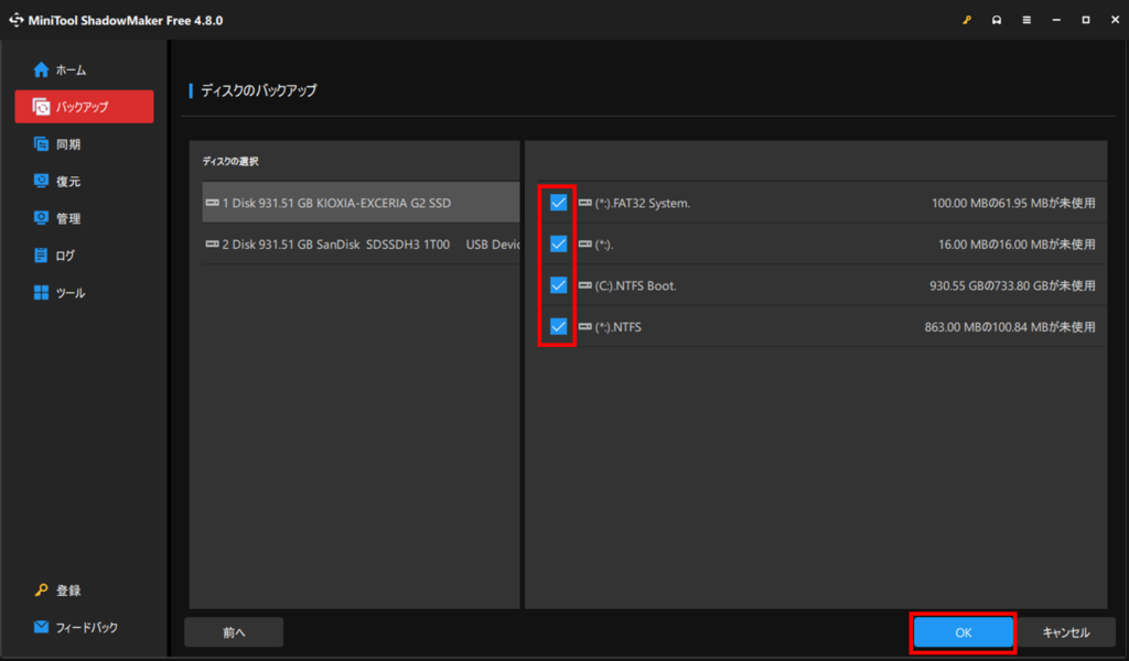 バックアップしたいパーティションを選択してOKボタンを押します。